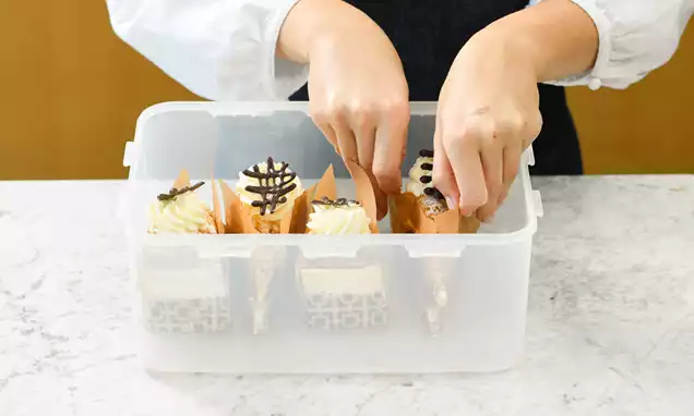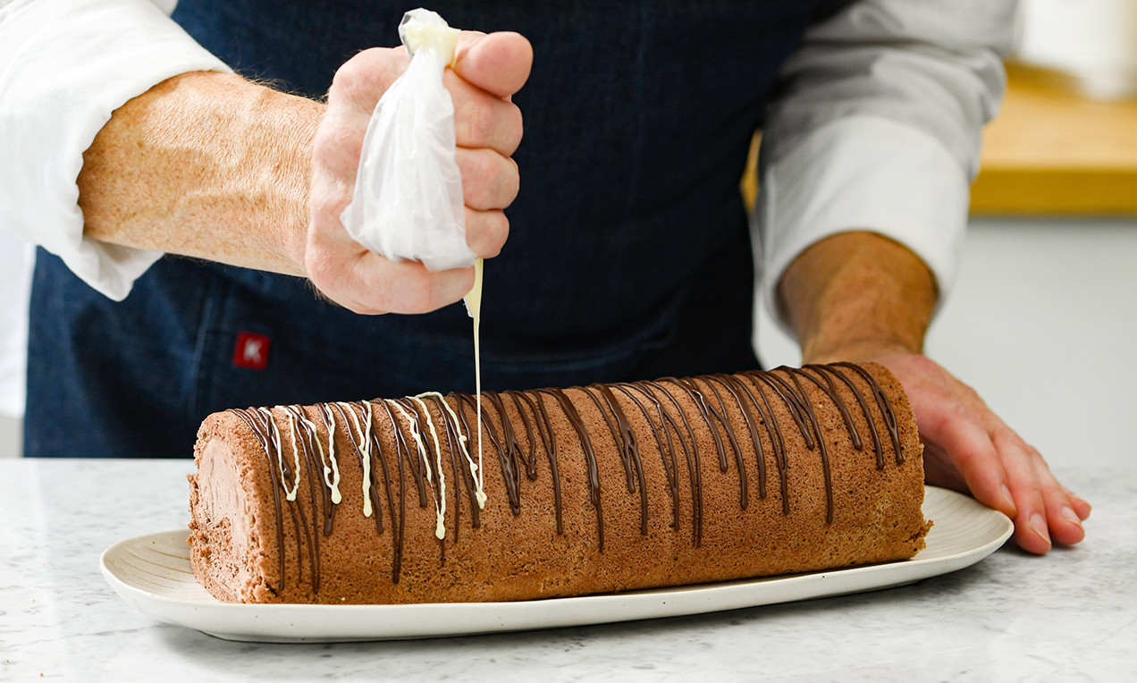 Etwa 50 g beliebige Kuvertüre oder Schokolade (weiß, Zartbitter, Vollmilch) grob zerkleinern, in einen kleinen Gefrierbeutel geben und gut, z. B. mit einem Clip, verschließen. Die Kuvertüre bei schwacher Hitze im Wasserbad schmelzen. Den Beutel gut abtrocknen, eine kleine Ecke abschneiden und die Kuvertüre nach Wunsch nur in eine Richtung oder in Spiralen über die Biskuitrolle sprenkeln. Für einen zweifarbigen Effekt zusätzlich etwa 20 g einer anderen Kuvertüre ebenso schmelzen und über die Biskuitrolle sprenkeln, wie z. B. bei der Schoko-Sahne-Rolle.