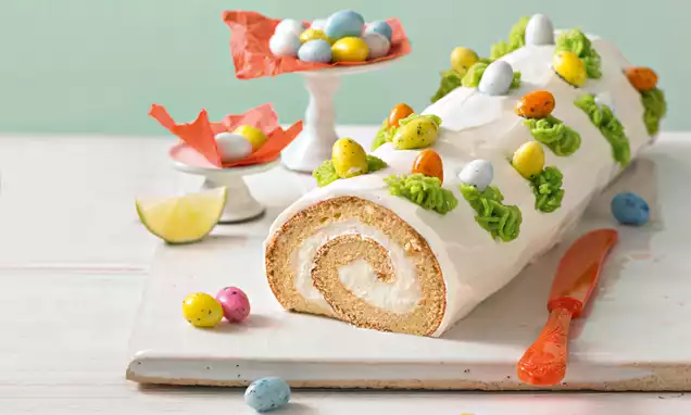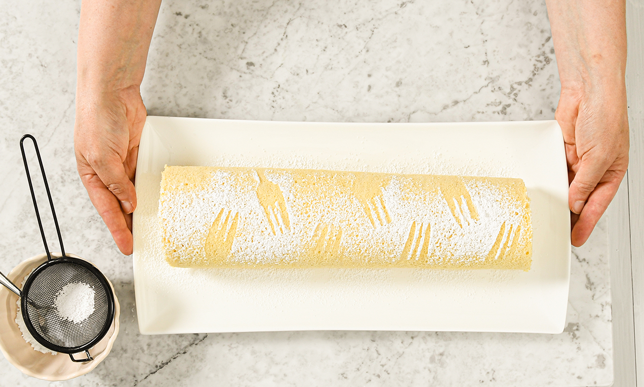 Kuchengabeln auf die Biskuitrolle, z. B. die Himbeer-Sahne-Rolle legen und mit Hilfe eines Siebes mit Puderzucker bestreuen. Die Kuchengabeln vorsichtig abnehmen.