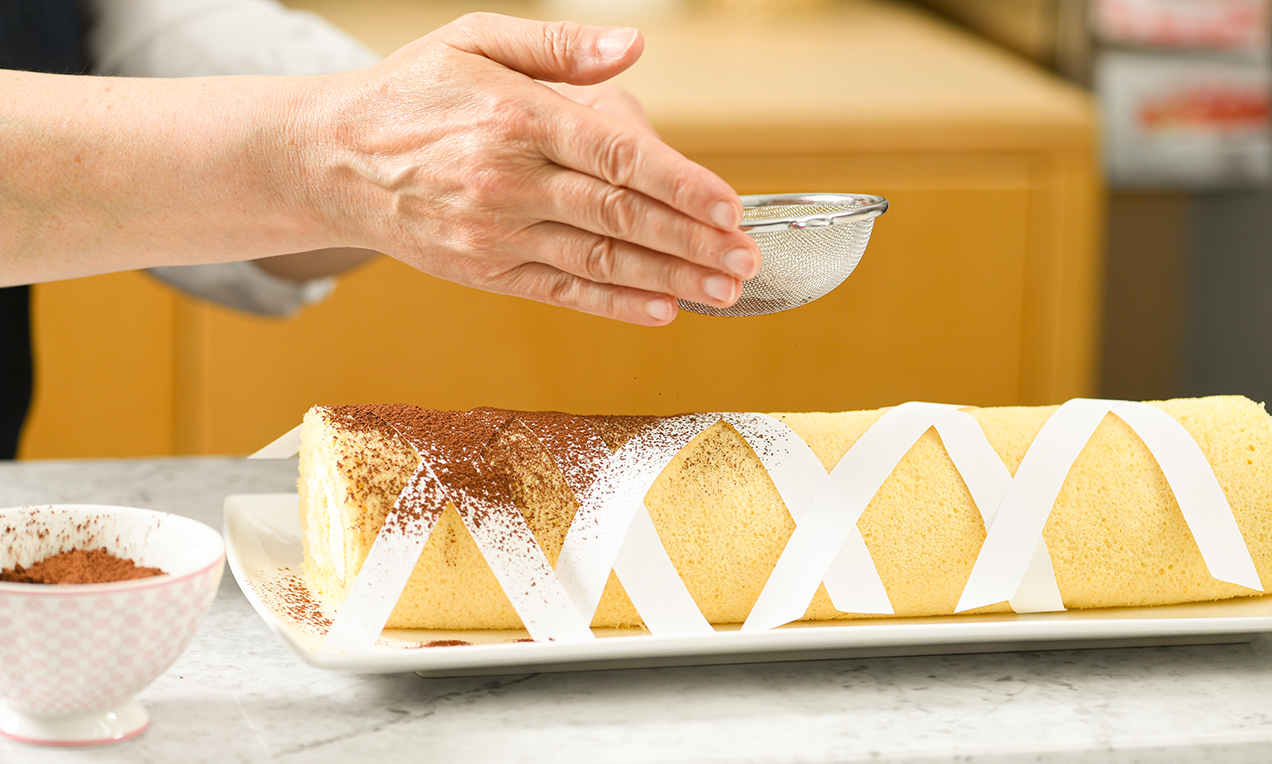 Schmale Papierstreifen nach Wunsch auf die Biskuitrolle legen. Kakao mit Hilfe eines Siebes auf die Rolle streuen. Die Papierstreifen vorsichtig nacheinander abnehmen.