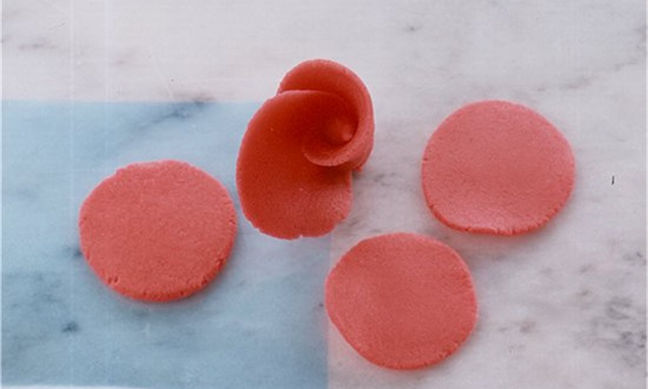 Für eine Rose einen 3 cm langen Kegel formen. Für die Blütenblätter die einzelnen Marzipanstücke nochmals kneten, zu Kugeln formen und zwischen 2 Folien zu runden Blättern ausstreichen, die zum Rand hin dünner werden (Abb. 2).