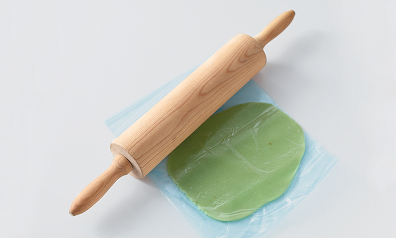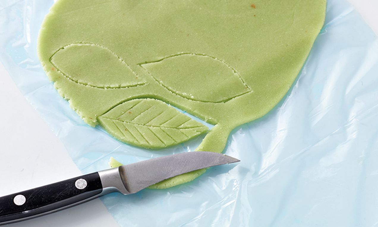 Für die Blätter etwas verknetetes Marzipan mit grüner Speisefarbe färben und zu einer etwa 1 cm dicken Rolle formen. Diese in gut 1 cm breite Stücke schneiden und jeweils etwas flach andrücken. ODER Marzipan zwischen einem aufgeschnittenen Gefrierbeutel ausrollen (Abb. 4).