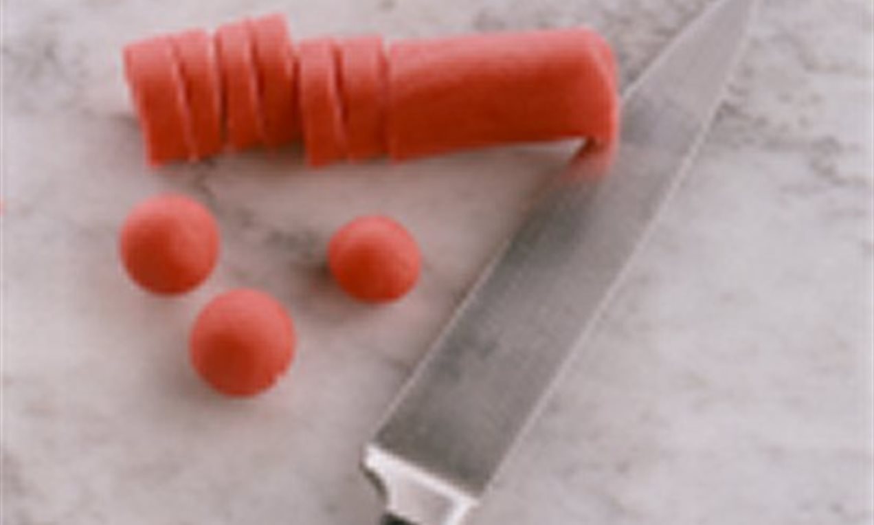 Für die Blüten gut die Hälfte des verkneteten Marzipans mit roter Speisefarbe einfärben und zu einer etwa 1 cm dicken Rolle formen. Die Rolle in gut 1 cm breite Stücke schneiden (Abb. 1).