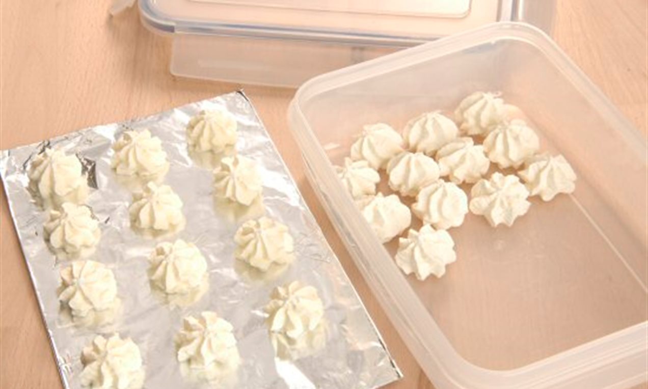Wenn steif geschlagene Sahne übrig geblieben ist, spritzen Sie diese als Tuffs auf Alufolie. Die Tuffs auf der Folie im Gefriergerät vorfrieren, dann die gefrorenen Tuffs einpacken und bis zur weiteren Verwendung im Gefriergerät lagern. So hat man immer einen Vorrat an Verzierungen für Torten oder auch Desserts.