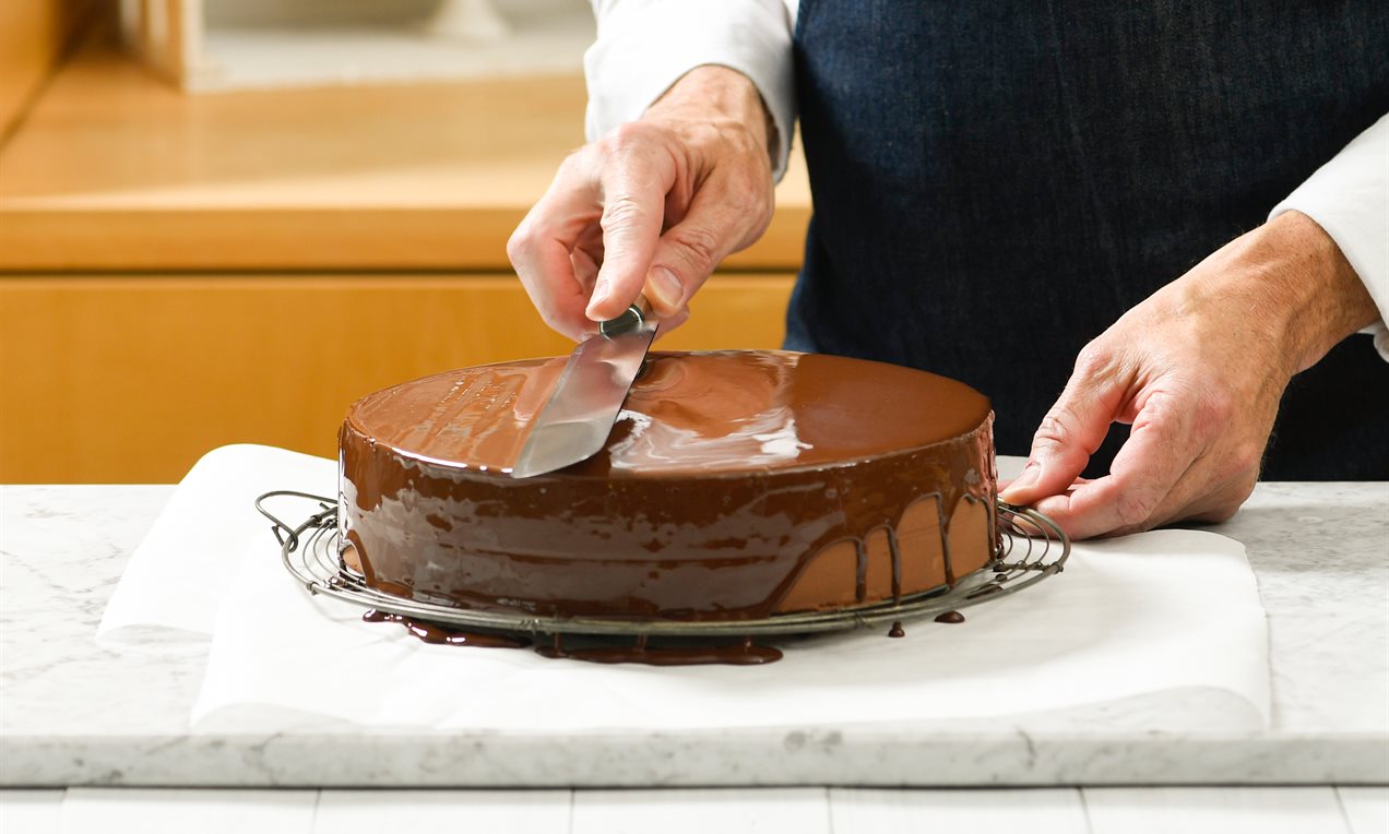 Beim Überziehen muss zügig gearbeitet werden, damit der Guss erst fest wird, wenn er gleichmäßig aufgetragen und die Torte umgesetzt ist.