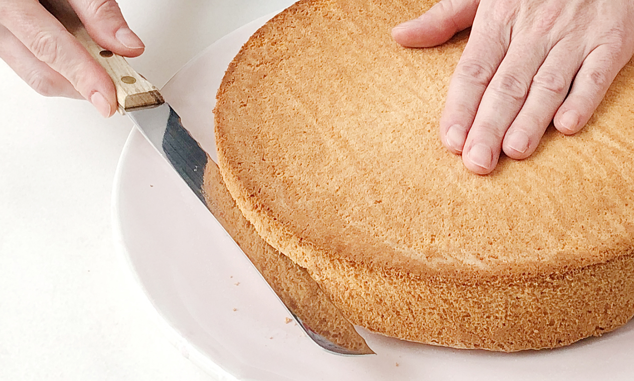 Damit die Schichten gleichmäßig dick werden, schneiden Sie den Tortenboden am Rand zuerst mit dem Messer ringsherum etwa 1 cm tief ein. Dann den Tortenboden mit der anderen Hand langsam drehen und dabei mit kurzen Sägebewegungen bis zur Mitte durchschneiden. Das Messer dabei immer waagerecht halten.