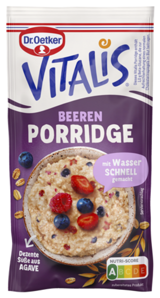 Alternativ zum Frühstück oder als leckerer Snack für Zwischendurch. Vitalis Porridge lässt sich mit kochendem Wasser, Milch oder veganen Drinks schnell und einfach zubereiten. Durch die Kombination von zarten Vollkornhaferflocken und der dezenten Süße aus Agave bietet Vitalis Porridge genau die richtige Basis für einen gelungenen Start in den Tag. Klassisch oder fruchtig an einem Tag, schokoladig oder nussig am anderen Tag: Hier ist für alle etwas dabei. Der praktische Portionsbeutel ist perfekt für ein Porridge to-go oder wenn es einfach mal schneller gehen muss. Alle fünf Sorten überzeugen durch einen Nutri-Score A. Ein attraktives Frühstück für zu Hause bieten die drei Sorten der Porridge Großpackungen, welche durch individuelle portionierbare Portionsgrößen überzeugen.