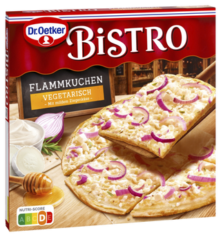Bistro Flammkuchen, ist die beliebte Köstlichkeit in lockerer, lebendiger Atmosphäre, die einlädt, den Moment zu genießen. Der dünne Boden, direkt auf Stein gebacken, ist lecker knusprig und kross. Verfeinert mit Crème Fraîche gibt es diese leckere Spezialität in den Varianten „Klassisch nach Elsässer Art“, und „Vegetarisch mit mildem Ziegenkäse“. Genieße den unwiderstehlichen Geschmack unseres Bistro Flammkuchens. Dieser knusprige TK-Flammkuchen bringt die traditionelle französische Küche direkt zu dir nach Hause. Bistro Flammkuchen bildet den Nutri-Score ab.