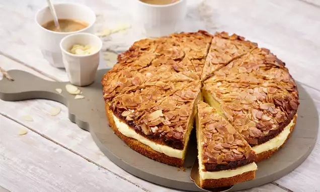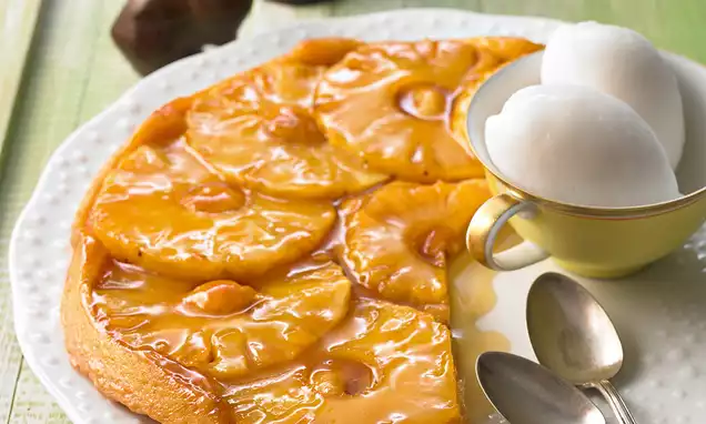 Butter, Zucker und Sahne in einem Topf unter Rühren langsam erhitzen, kurz aufkochen, die Mandeln vorsichtig unterheben und alles etwa 2 Min. einkochen lassen. Masse heiß auf den Ananasstücken verteilen. Form auf dem Rost in den Backofen schieben.