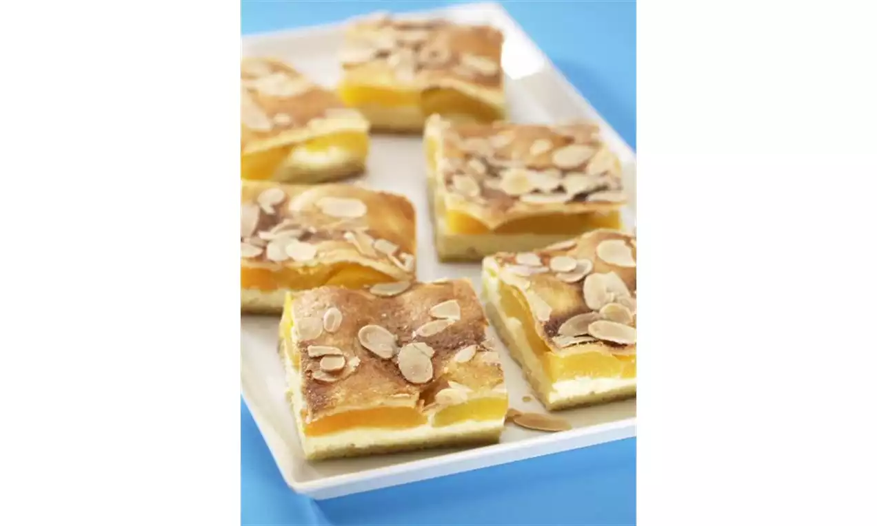 Hefeteig aus der Schüssel nehmen, auf der Arbeitsfläche nochmals kurz durchkneten, mit dem Mürbeteig gut verkneten. Die Hälfte des Teiges auf dem Backblech ausrollen, mit der abgekühlten Pudding-Creme bestreichen und die Aprikosen darauf verteilen. Restlichen Teig in Größe des Backblechs ausrollen, auf die Aprikosen legen, an den Rändern mit Hilfe einer Teigkarte andrücken.