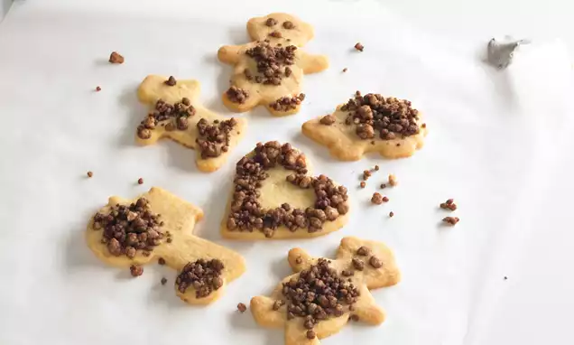 Biskuitplatte vorsichtig lösen, auf ein mit Zucker bestreutes Stück Backpapier stürzen. Das mitgebackene Backpapier mit kaltem Wasser bestreichen und vorsichtig, aber schnell abziehen. Die Gebäckplatte erkalten lassen.