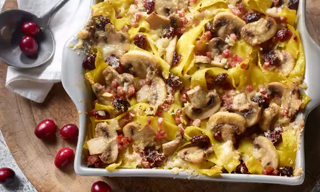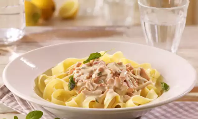 Bandnudeln nach Packungsanleitung in Salzwasser kochen und mit der Soße servieren.