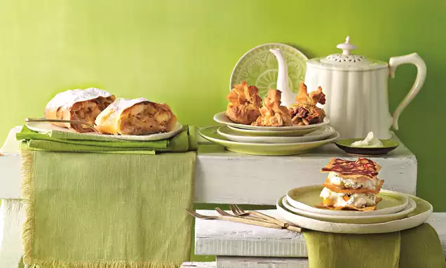 Anschließend vom übrigen Teig 1/3 abnehmen und daraus 2 Rollen (je 40 cm) rollen. Die Rollen als Rand in die Form drücken. Übrigen Teig auf leicht bemehlter Arbeitsfläche dünn ausrollen und in etwa 1 cm breite Streifen schneiden.