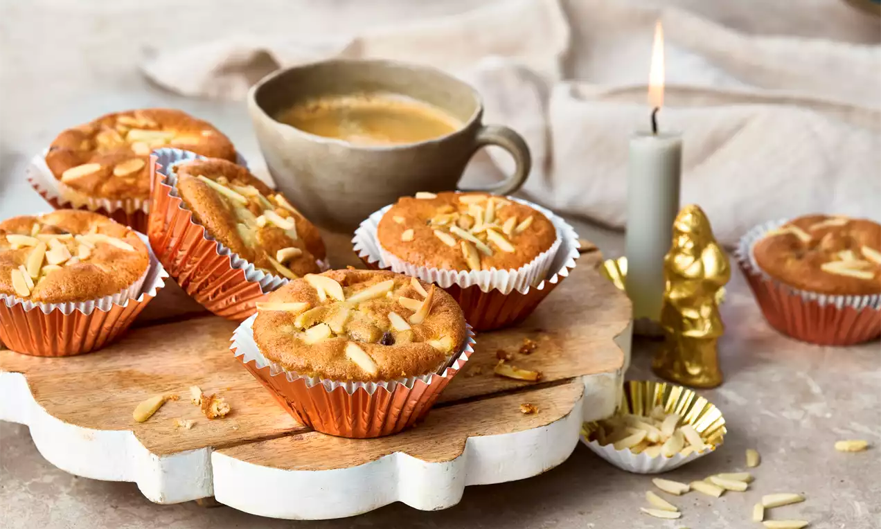 Mehl mit Backin in einer Rührschüssel mischen. Übrige Zutaten hinzufügen und alles mit einem Mixer (Rührstäbe) kurz auf niedrigster, dann auf höchster Stufe 2 Min. zu einem glatten Teig verarbeiten. Bratapfelfüllung unterheben. Den Teig gleichmäßig in der Muffinform verteilen und einige gesplitterte Mandeln aufstreuen. Muffinform auf dem Rost in den Backofen schieben.