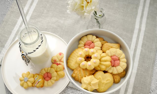 Puderzucker und Gustin sieben. Butter mit Puderzucker, Gustin, Salz und Finesse in einer Rührschüssel mit einem Mixer (Rührstäbe) zu einer glatten Masse verrühren. Zunächst 150 ml Milch, dann das Mehl unterrühren. Sollte der Teig zu fest sein, übrige Milch unterrühren. Motivscheibe nach Wahl einlegen, Teig portionsweise in die Gebäckpresse geben und verschließen. Teig als Plätzchen auf das Backblech setzen und in den Backofen schieben.