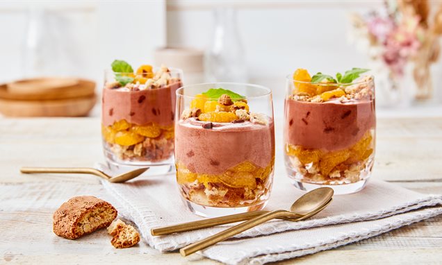 Mousse in die Dessertgläser einschichten und mit Mandarinen und Cantuccini dekorieren. Cantuccini Dessert mind. 1 Std. in den Kühlschrank stellen.