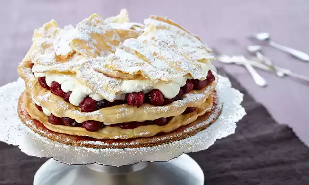 Den oberen Boden des mittleren Biskuits (Ø 24 cm) mit der Oberseite nach unten auf eine Tortengarnierscheibe legen. Einen Tortenring oder den gesäuberten Springformrand darumstellen.