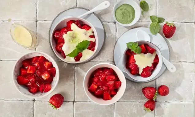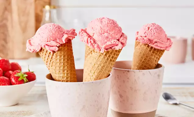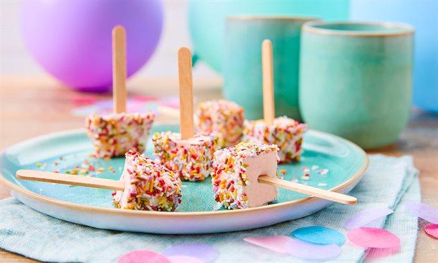 Das Erdbeereis am Stiel aus den Eiswürfelbehältern lösen und etwa 20 Min. bei Zimmertemperatur stehen lassen. Dann das Erdbeereis in den Zuckerstreuseln wälzen.