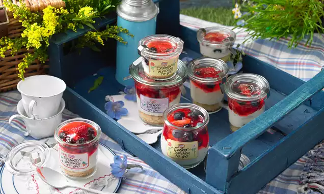 Erdbeeren vorsichtig waschen und putzen. Einige Erdbeeren mit Grün zum Dekorieren zur Seite legen. Den Rest vierteln oder sechsteln und gleichmäßig auf der Schmand-Creme verteilen.