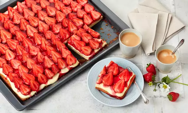 Tortenguss mit Zucker und Wasser nach Packungsanleitung zubereiten und auf den Erdbeeren verteilen. Den Erdbeerkuchen mit Schmand mind. 3 Std. in den Kühlschrank stellen.