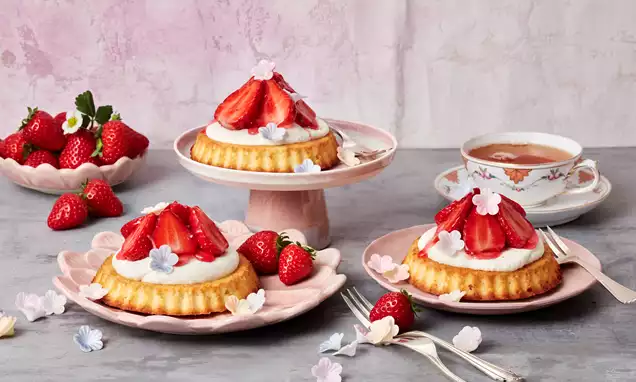 Mitgebackenes Backpapier abziehen und den Erdbeer-Tortenboden auf eine Tortenplatte legen. Um den Tortenboden einen Tortenring oder den gesäuberten Springformrand stellen.