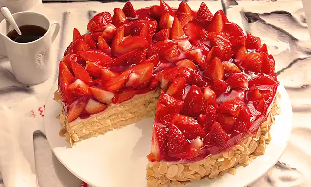 Erdbeeren vorsichtig waschen, putzen und grob zerkleinern. Erdbeerstücke oder aufgetaute Erdbeeren in einer Rührschüssel mit Zitronensaft pürieren. Erst Gelatine fix unterrühren, dann Zucker und Vanillin-Zucker unterrühren. Die Erdbeerfüllung auf dem Boden verstreichen und den Kuchen so lange in den Kühlschrank stellen, bis die Erdbeerfüllung fest geworden ist.