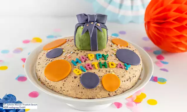 Kurz vor dem Servieren Fondant-Decke auf Ø etwa 36 cm ausrollen und den Kuchen damit einkleiden. Buchstaben, Ziffern, Gebäckschmuck und Dekorherzen mit Zuckerschrift ankleben.