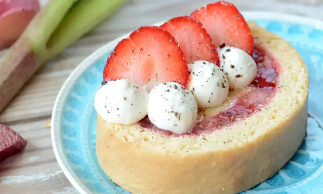 Mitgebackenes Backpapier abziehen und Kuchen waagerecht halbieren. Frischkäse, Zitronensaft, Dekorzucker (liegt der Backm. bei) und Sahne oder Milch miteinander verrühren und auf dem unteren Boden verstreichen, dabei 1 cm Rand frei lassen. Oberen Boden auflegen.