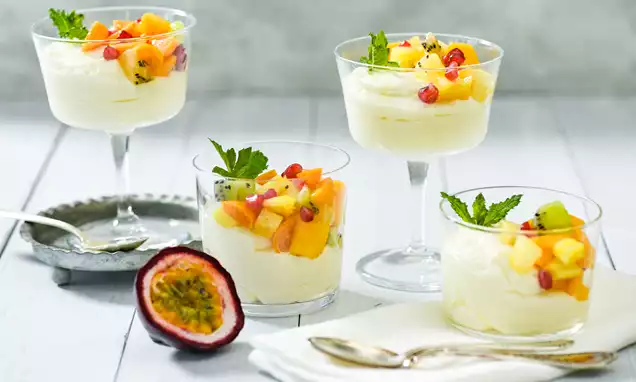 Pfirsichspalten für die Dekoration evtl. klein schneiden. Quarkspeise mit den Choco Crossies®, Pfirsichstücken und Minze verzieren. Sofort servieren oder bis zum Servieren in den Kühlschrank stellen.