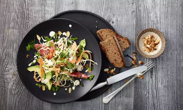 Kartoffeln waschen, in Salzwasser in etwa 20 Min. gar kochen, abkühlen lassen und dann pellen. In der Zwischenzeit Paprika vierteln, Kerne entfernen, waschen und in Würfel schneiden. Die Zwiebeln abziehen, halbieren und in Streifen scheiden.