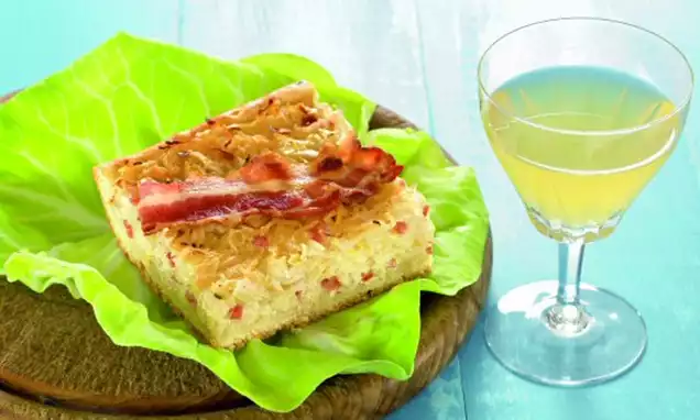 Wasser in einem kleinen Topf aufkochen, vom Herd nehmen und Natron vorsichtig einrühren. Übriges Teigdrittel auf leicht bemehlter Arbeitsfläche zu einem Rechteck (etwa 30 x 26 cm) ausrollen. Teigplatte mit 1/2 Becher Crème fraîche bestreichen. Mit 4 EL Röstzwiebeln und 25 g Schinken-Nuggets bestreuen. Käse gleichmäßig darauf verteilen und etwas andrücken. Teigplatte mit einem Teigrädchen einmal längs halbieren, so dass 2 Rechtecke (30 x 13 cm) entstehen. Platte von der langen Seite her in etwa 2 cm breite Streifen schneiden. Jedes Stück etwas eindrehen und auf das Backblech legen. Zwirbel noch einmal gehen lassen, bis sie sich vergrößert haben. Mit der Lauge bestreichen und backen.