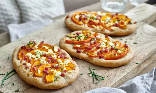Übrige Crème fraîche mit übrigen Röstzwiebeln und Schinken-Nuggets verrühren und zu den lauwarmen Laugenzwirbeln servieren.
