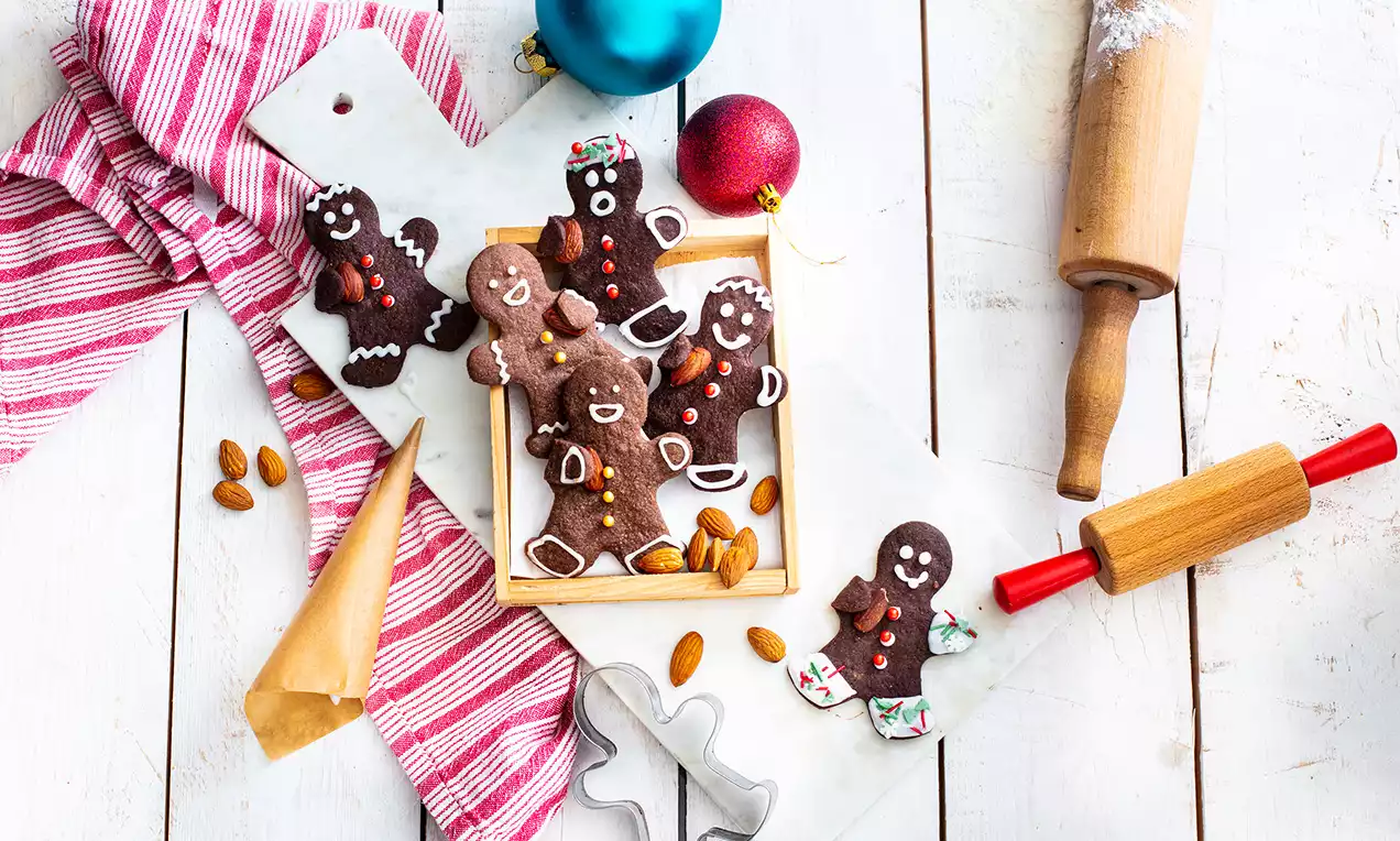 Mürbeteig portionsweise auf leicht bemehlter Arbeitsfläche etwa 1/2 cm dick ausrollen. Mit der Ausstechform Lebkuchenmännchen ausstechen und auf das Backblech legen. Jeweils eine Mandel auflegen und ein "Ärmchen" darum biegen, so dass es so aussieht, als würden die Lebkuchenmännchen die Mandel festhalten. Plätzchen backen.