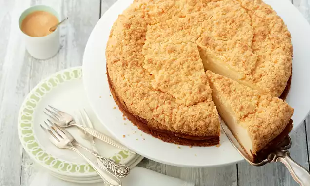 Springformrand lösen und entfernen, Boden auf einen mit Backpapier belegten Kuchenrost stürzen, Springformboden entfernen und Gebäck erkalten lassen.