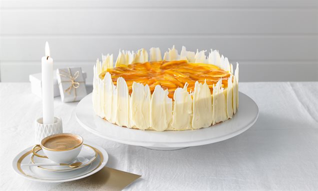 Tortenring lösen und entfernen. Kuvertürestreifen an den Rand stellen. Übrige Mango in beliebige Stücke oder Streifen schneiden und auf der Torte verteilen. Fruchtaufstrich in einem kleinen Topf erhitzen und über den Mangostücken verteilen.