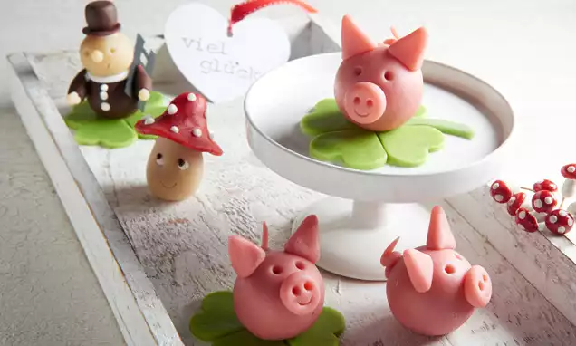 Puderzucker mit Wasser zu einem streichfähigen Guss verrühren. Die Marzipanplätzchen mit dem Zuckerguss bestreichen und sofort mit den kunterbunten Kristallen bestreuen.