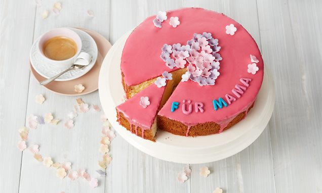 Den Kuchen vom Springformboden lösen und auf eine Tortenplatte schieben. Puderzucker mit Zitronensaft zu einem dickflüssigen Guss verrühren und mit rosa Lebensmittelfarbe einfärben. Guss mit einem Tafelmesser auf dem Kuchen verteilen. Die Dekorblüten zu einem Herz in die Mitte des Kuchens legen. Mit den Buchstaben den gewünschten Text auf den Muttertagskuchen schreiben.