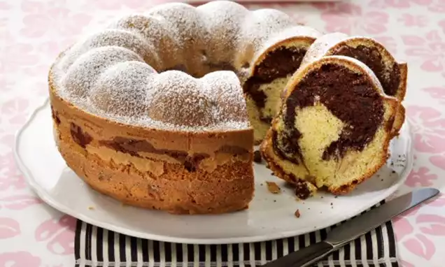 Nach 45 Min. eine Garprobe machen. Dafür mit einem Holzstäbchen in die Mitte des Kuchens stechen.Ist das Hölzchen trocken und haftet kein Teig mehr daran, ist der Kuchen gar.