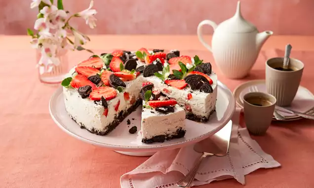 Oreo®-Kekse in grobe Stücke schneiden. Backblech mit Backpapier belegen. Backofen vorheizen.