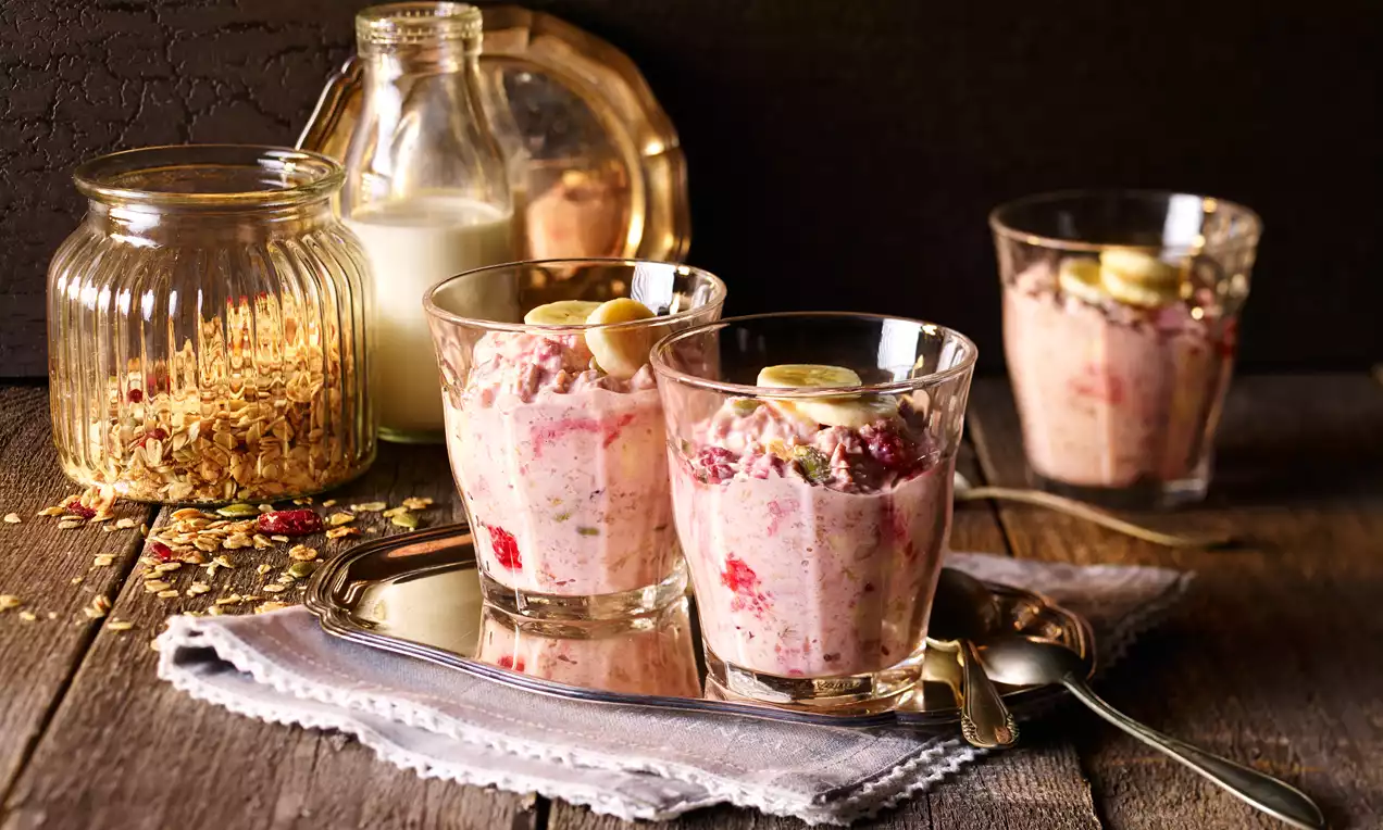 Tiefgekühlte Himbeeren, Müsli, Joghurt und Milch verrühren. Mit Frischhaltefolie abdecken und mind. 3 Std. oder über Nacht in den Kühlschrank stellen.