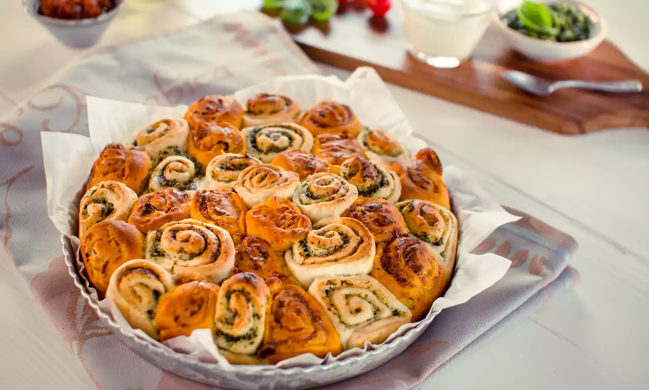 Mehl mit Hefeteig extra schnell in einer Rührschüssel sorgfältig vermischen. Übrige Zutaten, außer Pesto, hinzufügen und alles mit einem Mixer (Knethaken) in etwa 2 Min. zu einem glatten Teig verarbeiten. Teig halbieren. Eine Hälfte auf leicht bemehlter Arbeitsfläche zu einem Rechteck (etwa 50 x 25 cm) ausrollen.