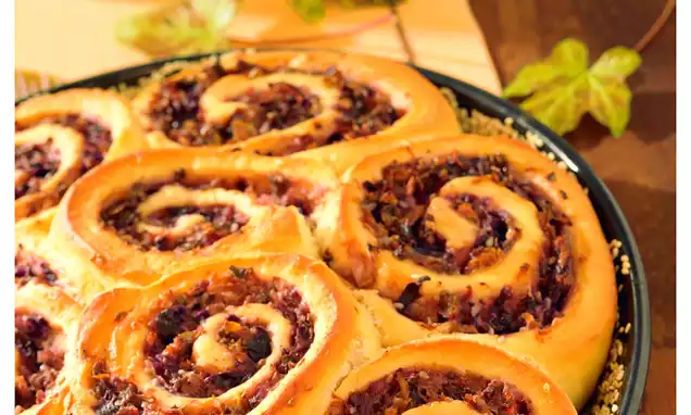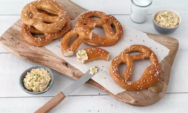 Etwa 1/3 der Füllung auf eine "1" streichen. Die zweite "1" auflegen, mit dem nächsten Drittel Füllung bestreichen, die dritte "1" auflegen und mit übriger Füllung bestreichen. Vor dem Servieren mit Salzbrezeln oder -stangen und Schnittlauch dekorieren.