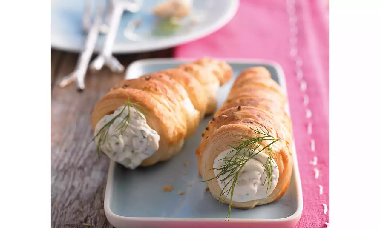Frühlingszwiebeln putzen, waschen und in feine Ringe schneiden. Fetakäse mit einer Gabel zerdrücken, mit dem Frischkäse und Crème fraîche verrühren. Masse mit Zitronensaft, Salz und Pfeffer würzen und Frühlingszwiebeln unterrühren. Einige Dillspitzen für die Dekoration zurückbehalten, restlichen Dill waschen, hacken und unter die Füllung heben. Die Füllung mit Hilfe eines Spritzbeutels mit Lochtülle (Ø 10 mm) oder einem Gefrierbeutel (eine kleine Ecke abschneiden) in die Schillerlocken spritzen. Die Schillerlocken mit den Dillspitzen garnieren und sofort servieren.