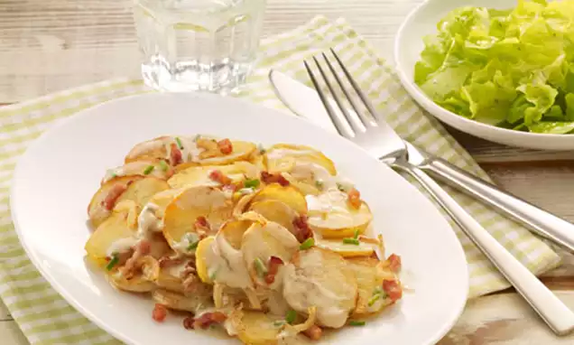 Kartoffeln waschen, in einem Topf mit Wasser bedeckt zum Kochen bringen und bei mittlerer Hitze in etwa 15 Min. gar kochen. Kartoffeln abgießen, noch heiß pellen, abkühlen lassen und in Scheiben schneiden. Backofen vorheizen.