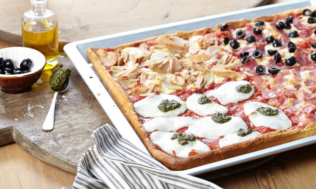 Tomatensoße gleichmäßig auf dem Boden verteilen. Ein Viertel der Pizza mit Mozzarella-Scheiben und Pesto, ein Viertel mit Thunfisch und Zwiebelscheiben, ein Viertel mit Schinken und ein Viertel mit Salami und Oliven belegen. Den restlichen geriebenen Käse darauf verteilen, den Mozzarella-Belag dabei aussparen. Die Pizza backen.
