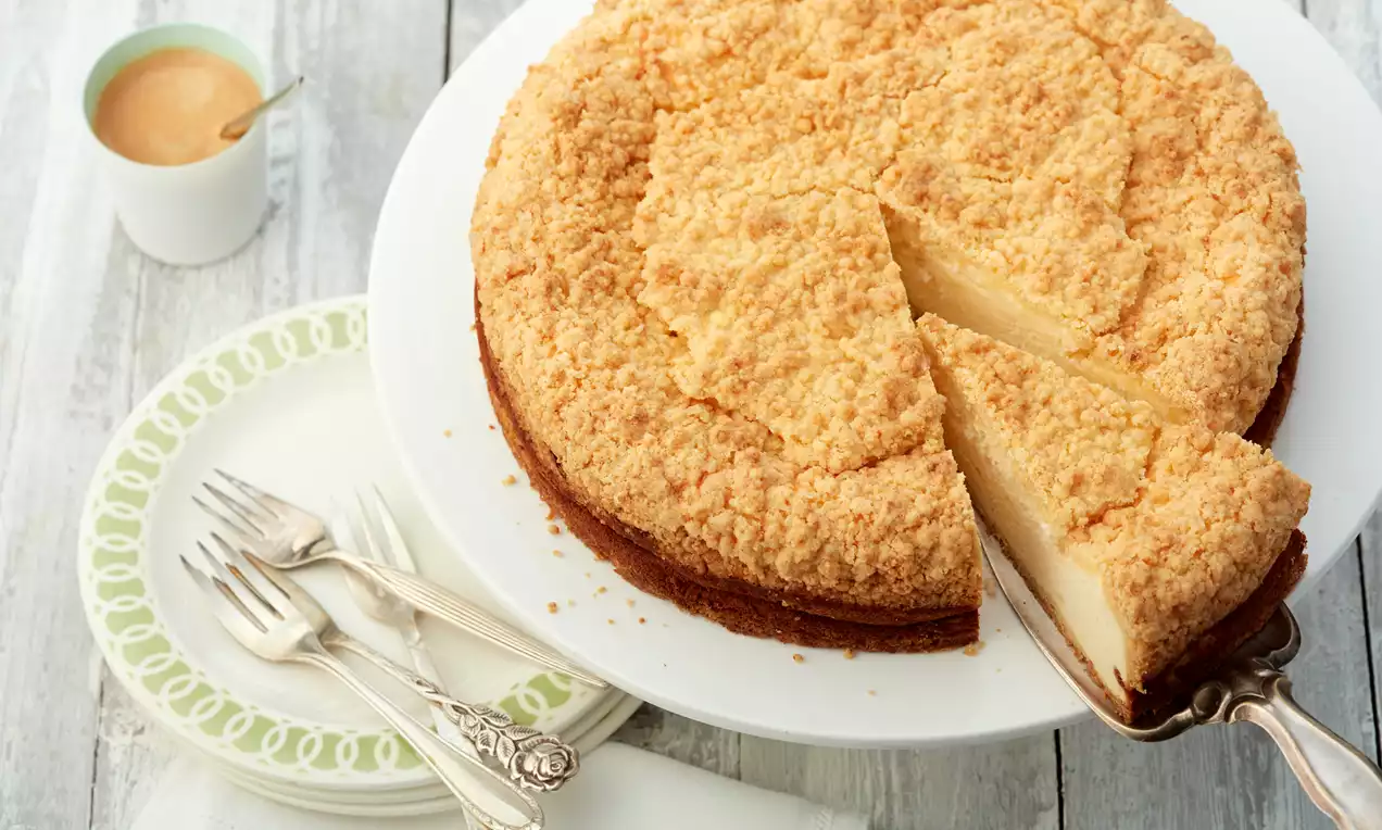 Quark-Streusel-Kuchen in der Form auf einen Kuchenrost stellen. Springformrand lösen, aber nicht entfernen und Kuchen erkalten lassen.