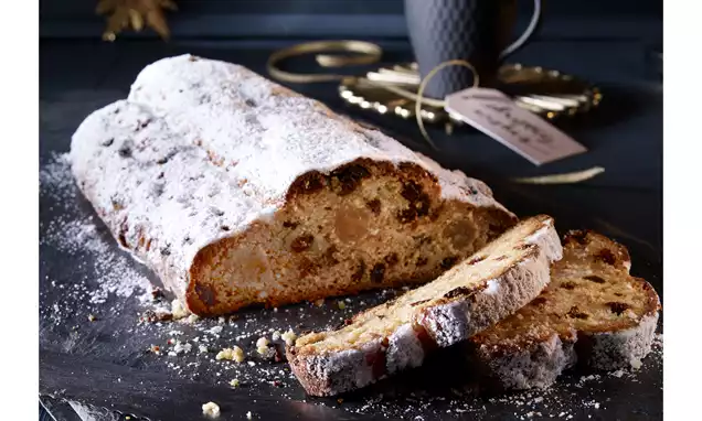 Den Teig mit Trockenfrüchten, Mandeln, Rosinen und Korinthen auf leicht bemehlter Arbeitsfläche verkneten. Den Teig zu einem Stollen formen: Teig zu einer 40 cm langen Rolle formen und mit dem Teigroller der Länge nach eine Vertiefung eindrücken (Abb. 1).