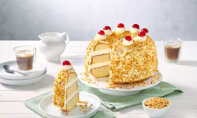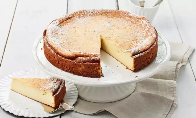 Quarkstollen mit Hefe nach dem Backen mit dem Backpapier auf einen Kuchenrost ziehen. Backrahmen entfernen. Butter zerlassen, den noch heißen Quarkstollen damit bepinseln und das Gebäck erkalten lassen.