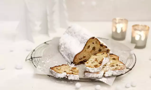 Den Quarkstollen mit Hefe mit Puderzucker bestreuen. Der Quarkstollen mit Hefe schmeckt am besten, wenn er in Alufolie gewickelt (Abb. 5) mind. 1 Woche durchzieht.