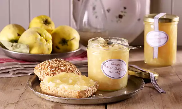 Gläser und Schraubdeckel (Twist-off) auskochen bzw. mit ganz heißem Wasser ausspülen. Quitten mit einem Tuch trocken abreiben, um den Flaum zu entfernen. Quitten schälen, vierteln, Kerngehäuse entfernen, fein schneiden und 500 g abwiegen. Birnen waschen, vierteln, Kerngehäuse entfernen, fein schneiden und 125 g abwiegen. Schalotten abziehen, halbieren, fein schneiden und 50 g abwiegen. Chilischote halbieren, Kerne entfernen, waschen und fein hacken. Hinweis: Da die Chilischoten sehr scharf sind, bei der Verarbeitung der Schoten am besten Einweghandschuhe anziehen. Thymian waschen, trocken tupfen und Blätter abzupfen.