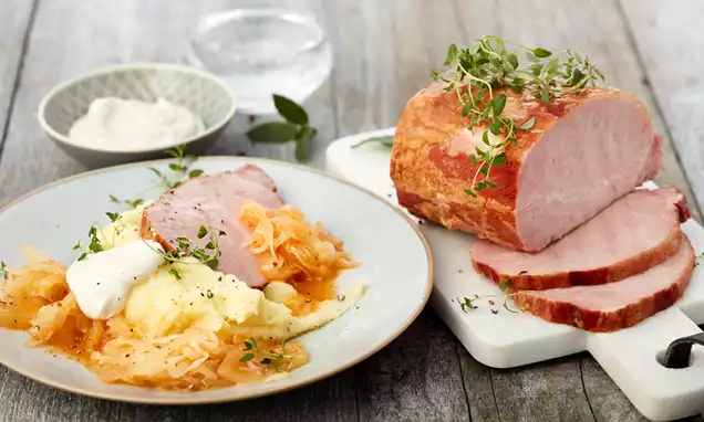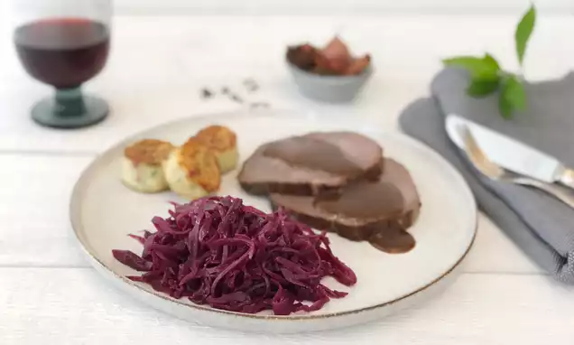 Den Sauerbraten in Scheiben schneiden, mit der Soße auf einer vorgewärmten Platte anrichten.